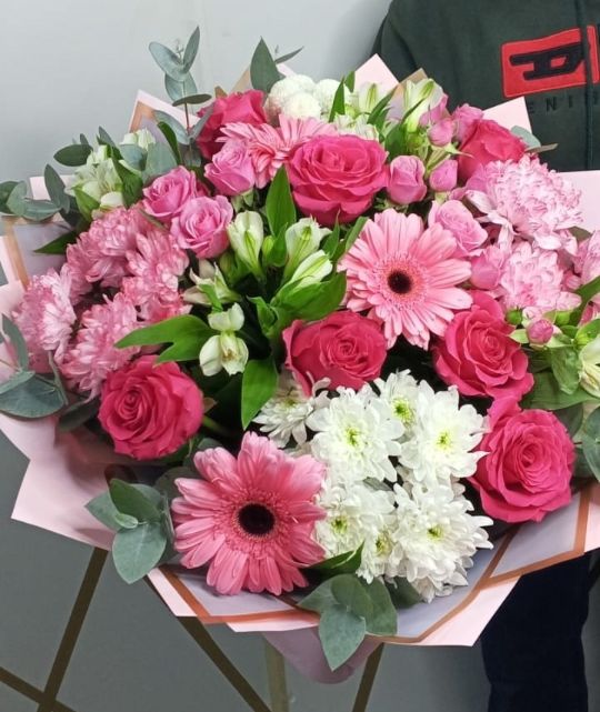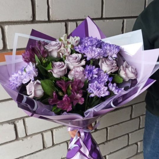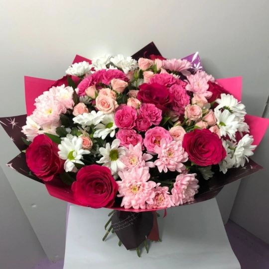 Сборный букет авторской сборки в сочетании с одноголовыми хризантемами и яркими кустовыми розами.