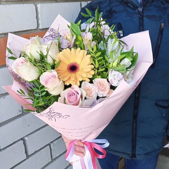 Изысканный букет из роз, герберы и воздушной эустомы.