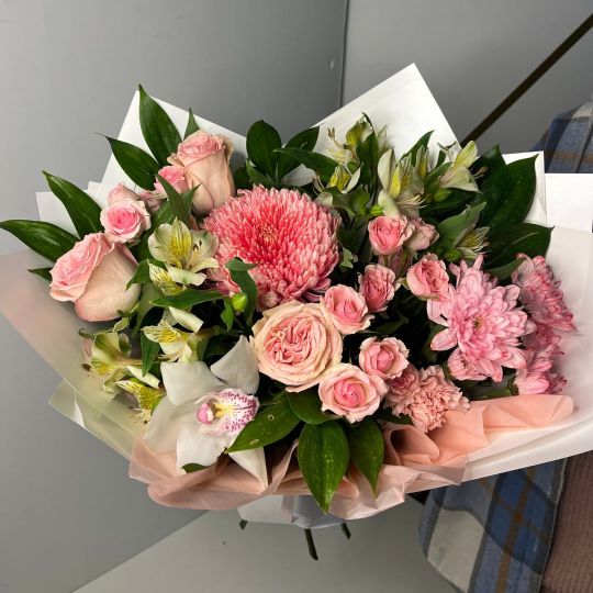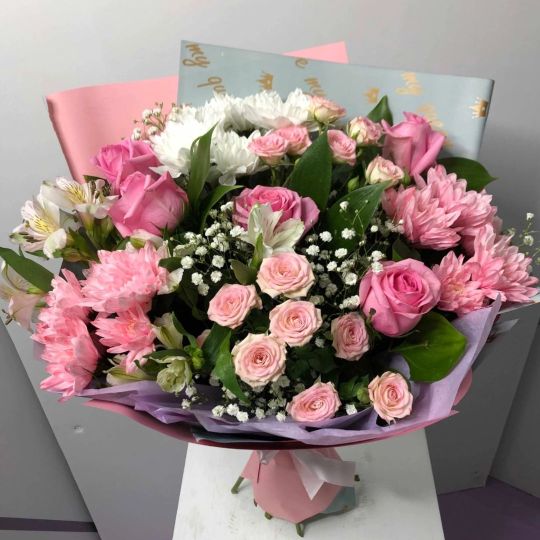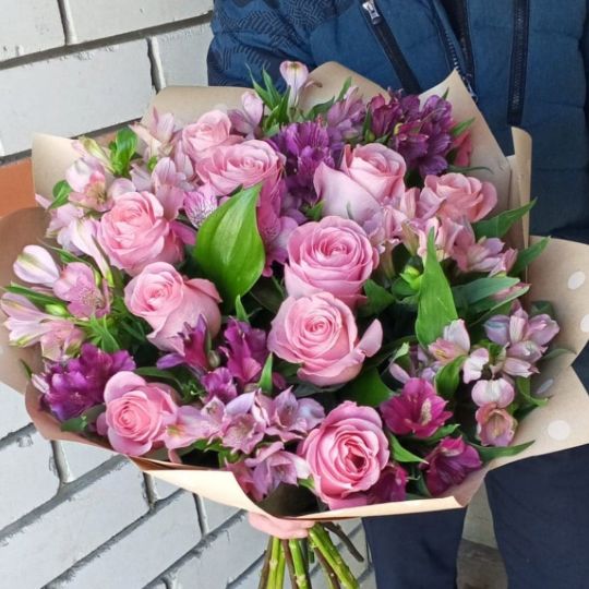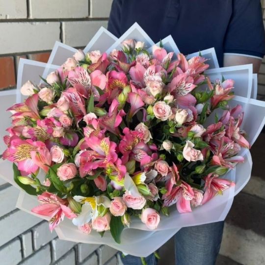 Объемный букет из кустовых роз и альстромерий в розовых оттенках.