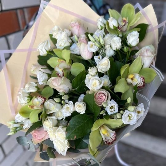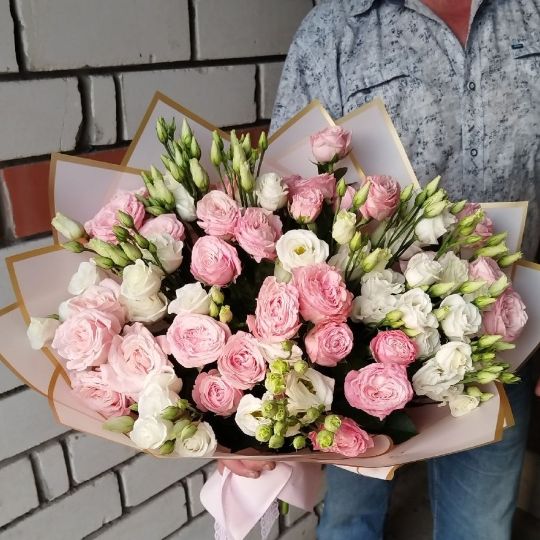 По-королевски роскошный букет из кустовых роз и нежных, воздушных эустом.