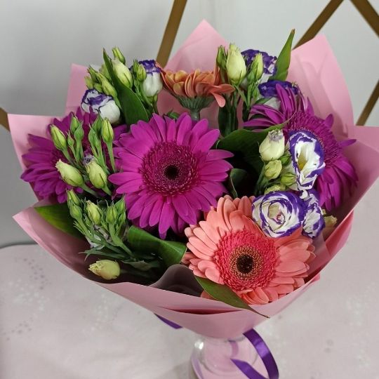 Аккуратный букет из гербер и нежной эустомы в оформлении.