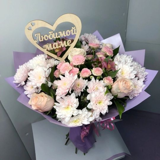 Шикарный сборный букет из роз, кустовых роз и хризантем в оформлении.