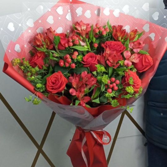 Огромный букет из красных роз, красных альстромерий, гиперикума, яркой зелени в оформлении.