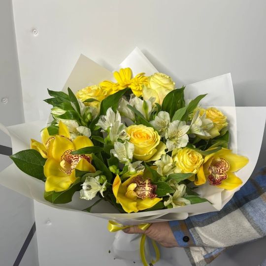 Великолепный, яркий, солнечный букет из сочетания желтых и белых цветов с добавлением орхидей.