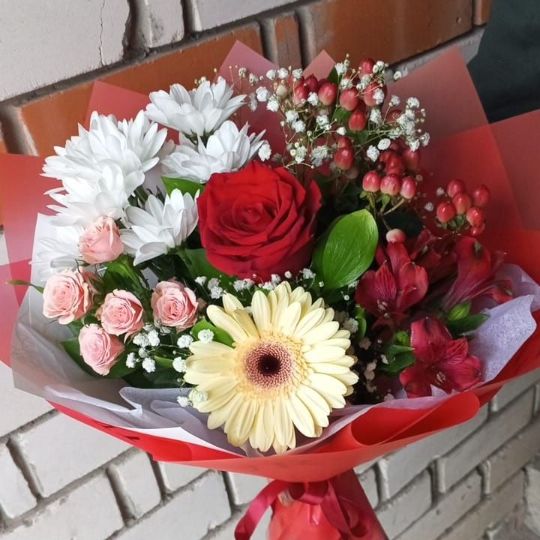 Небольшой красивый букет-комплимент в красно-белой гамме.