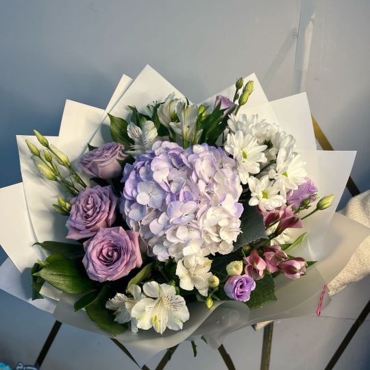 Шикарный букет из гортензии, роз и эустом в сочетании бело-фиолетовых оттенков.