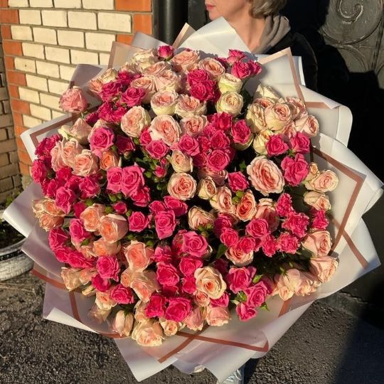 Букет из 35 кустовых разноцветных роз в оформлении.