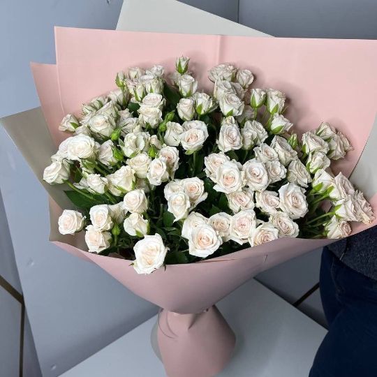 Букет из 25 кремовых кустовых роз в оригинальном оформлении.