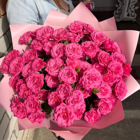 Букет из 35 нежно-розовых кустовых роз в фоамиране.