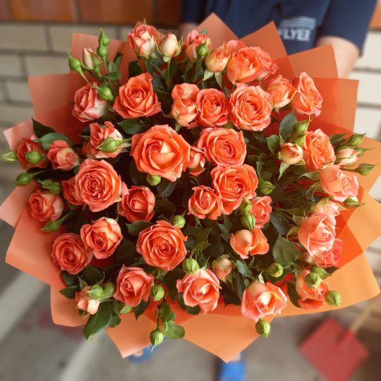 Букет из 15 пионовидных кустовых роз нежно-персикового цвета.