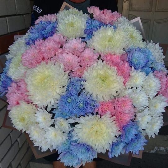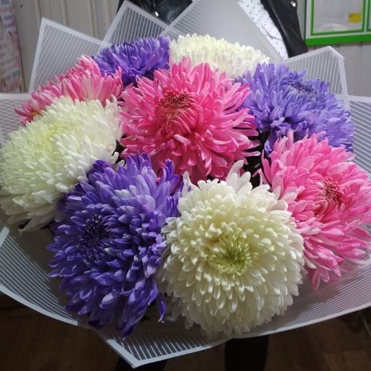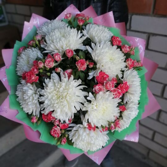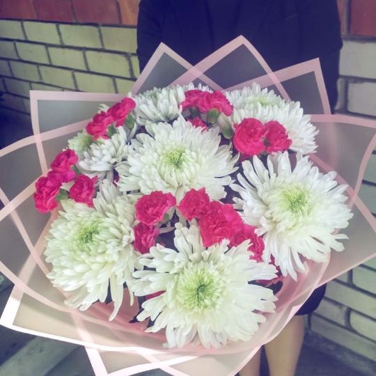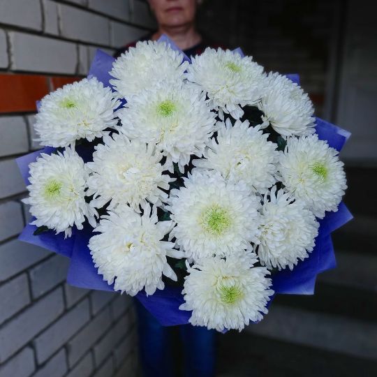 Нежный воздушный букет из кустовой хризантемы сорта Алтай в нежном оформлении. Эти цветы будут радовать своего обладателя долгое время!