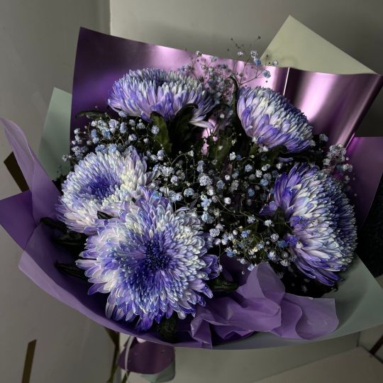 Букет из 5 одноголовых хризантем в характерном исполнении. Как кусочек космического пространства, завернутое в букет.