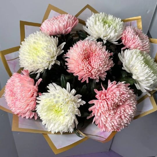 Микс из 9 одноголовых хризантем в розовом и белом исполнении в нежной упаковке.