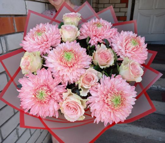 Букет из розовых роз и одноголовых хризантем в нежном оформлении.