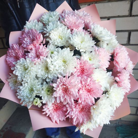 Букет из 9 кустовых хризантем в бело-розовой гамме. Будет долго сохранять свою свежесть и радовать своего обладателя.