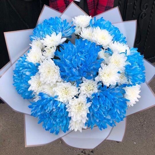 Букет из Хризантем сорта Кеннеди в бело-голубой гамме с нежным оформлением.