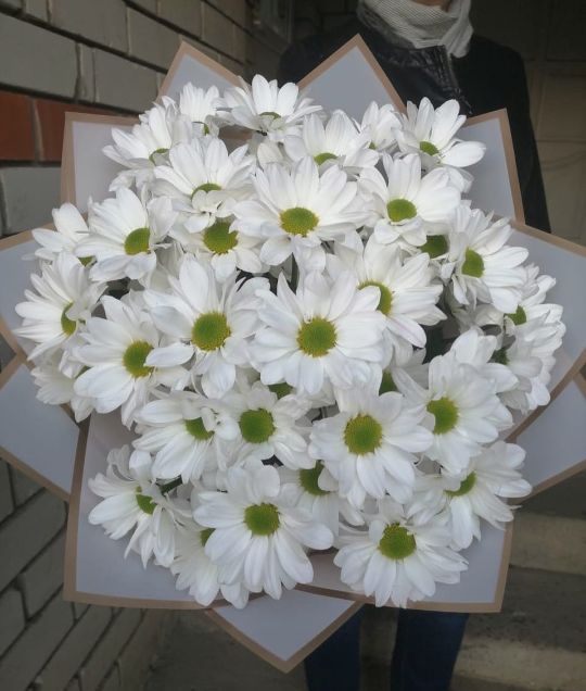 Нежный воздушный букет из 7 кустовых хризантем сорта Кеннеди. Выглядят как ромашки, но в отличие от матрикарии или полевой ромашки отличаются повышенной стойкостью.