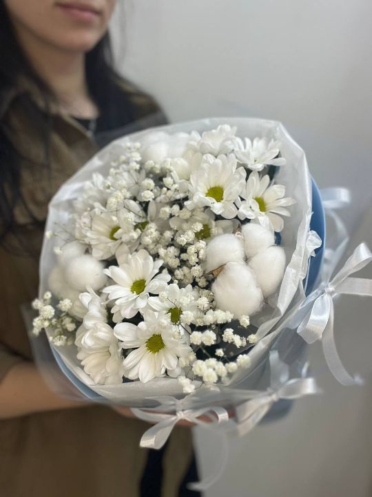 Великолепный романтичный букет из кустовых хризантем сорта Кеннеди с хлопком и гипсофилой в необычной упаковке "бантики"