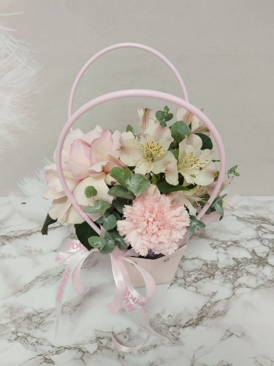 Нежная сумочка с розой, диантусом, альстромерией и ароматным эвкалиптом
