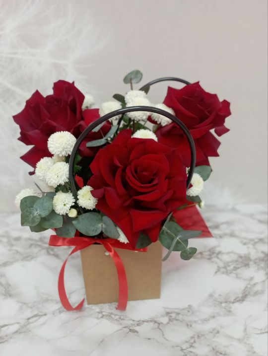 Воздушная сумочка из 5 французских роз с эвкалиптом