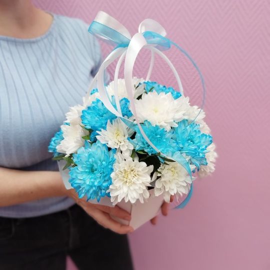 Композиция в сумочке из белых и голубых хризантем.