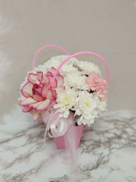 Великолепная обьемная сумочка с 3 белыми хризантемами, французской розой и розовым диантусом.