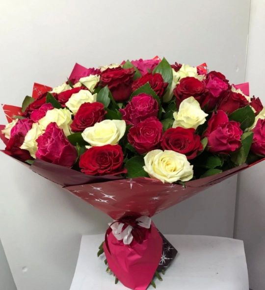 Букет из 51 кенийской розы 50 см, в цветовой гамме микс: красный, розовый, белый