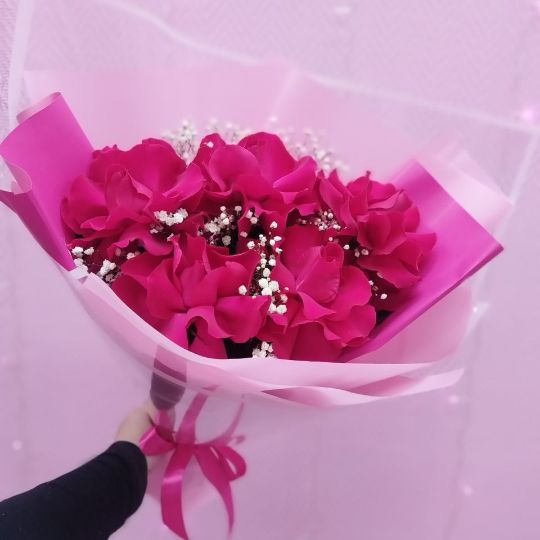 Букет из 5 малиновых французских роз с гипсофилой в авторском оформлении